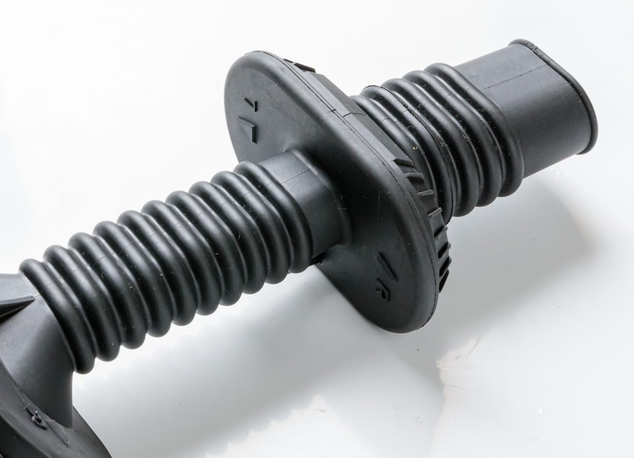 ゴム・シリコンと比較すると、成形サイクルが早いという利点があります。また、エラストマーは成形時に、食い切りと呼ばれるバリ処理の構造を必要としないため、後工程のバリ取り作業が発生せず、見た目も仕上がりもきれいです。